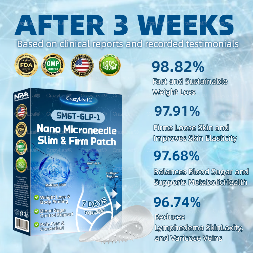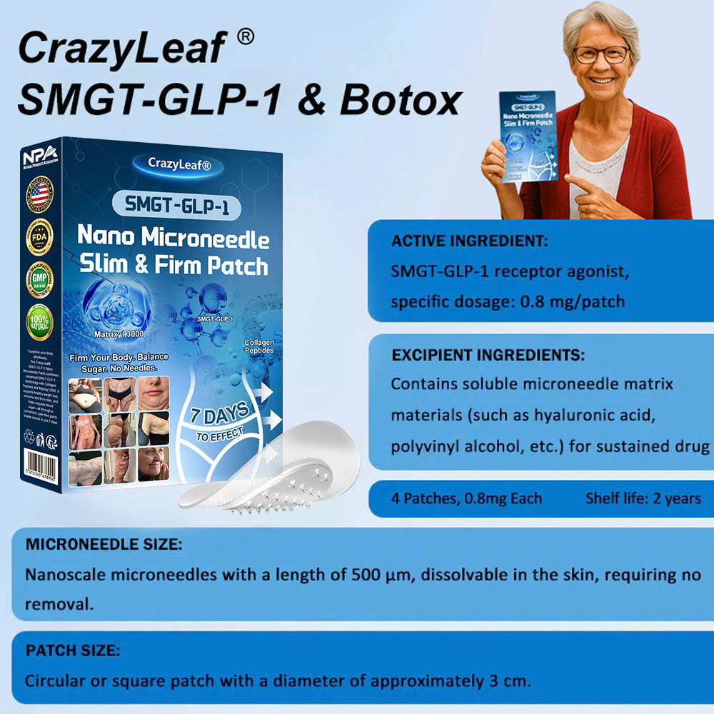 The CrazyLeafยฎ SMGT-GLP-1 Nano Microneedle Slim & Firm Patch was developed by a top team of endocrinology experts after years of research into weight loss and metabolic health. Its advanced formula promotes fat burning, stabilizes blood sugar, and boosts metabolism. It also contains Matrixyl 3000 to help lift and firm the skin, improving both body shape and skin tone.
